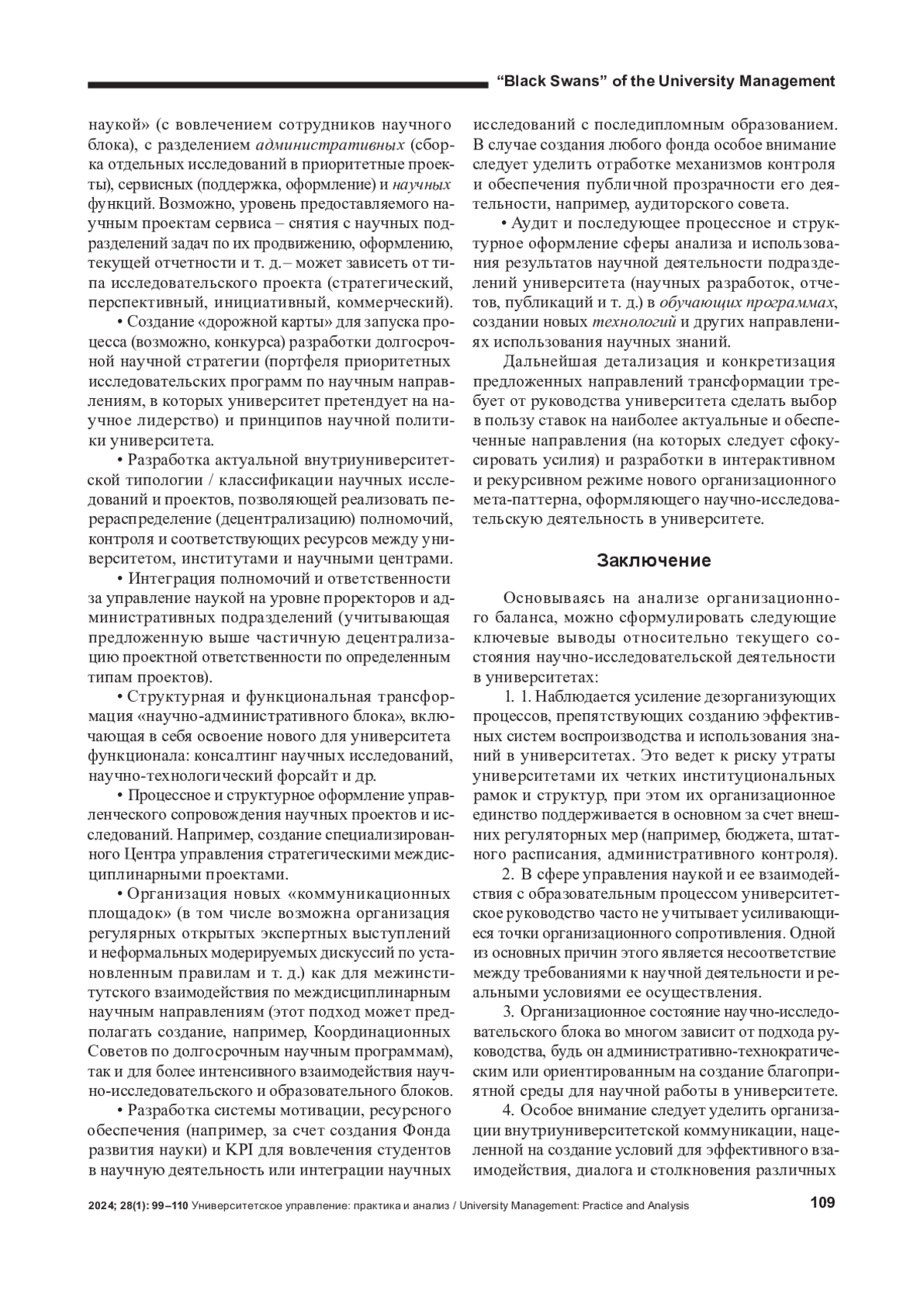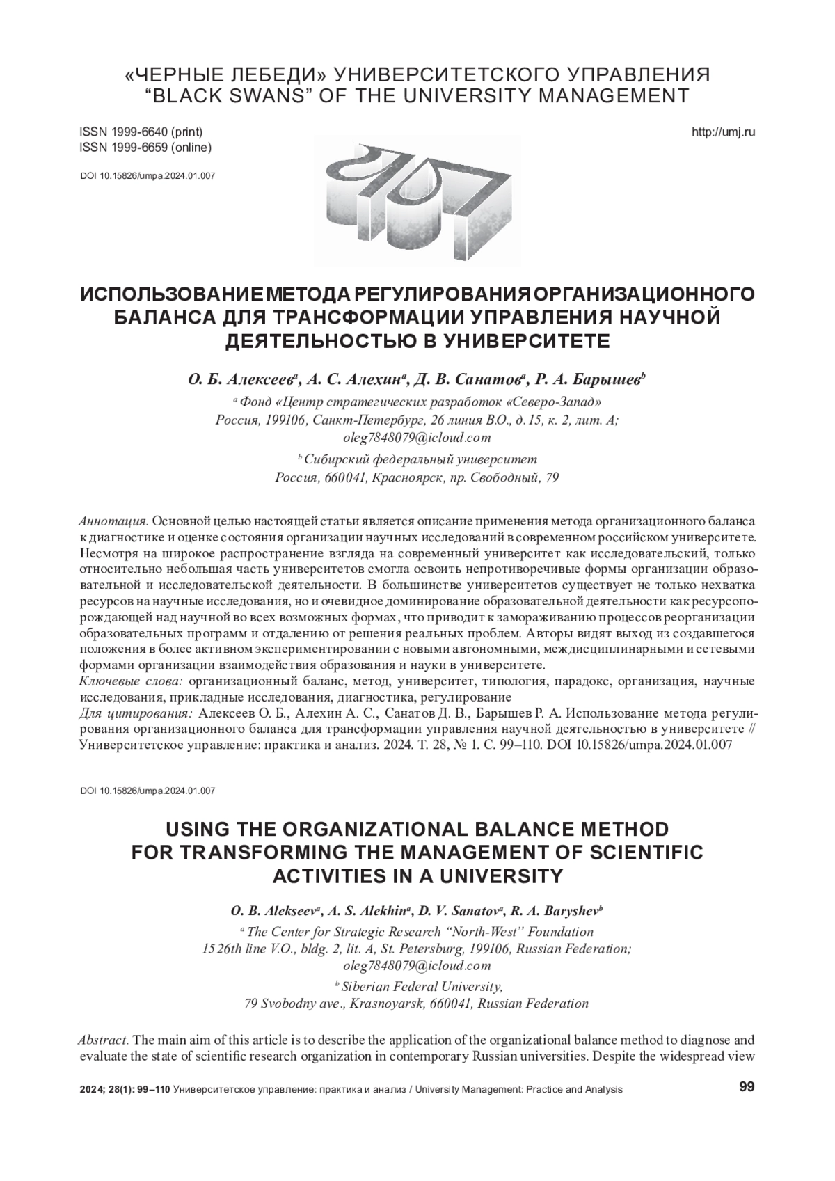 Основной целью настоящей статьи является описание применения метода организационного баланса к диагностике и оценке состояния организации научных исследований в современном российском университете. Несмотря на широкое распространение взгляда на современный университет как исследовательский, только относительно небольшая часть университетов смогла освоить непротиворечивые формы организации образовательной и исследовательской деятельности. В большинстве университетов существует не только нехватка ресурсов на научные исследования, но и очевидное доминирование образовательной деятельности как ресурсопорождающей над научной во всех возможных формах, что приводит к замораживанию процессов реорганизации образовательных программ и отдалению от решения реальных проблем. Авторы видят выход из создавшегося положения в более активном экспериментировании с новыми автономными, междисциплинарными и сетевыми формами организации взаимодействия образования и науки в университете.