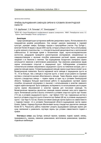 Среди красивоцветущих кустарников наиболее декоративна сирень. Использование её в ландшафтном дизайне разнообразно. Она находит широкое применение в парковой культуре, украшает скверы, бульвары городов и приусадебные участки. Род Syringa L. включает более 30 видов и свыше 2500 сортов, которые успешно могут быть использованы в целях зеленого строительства, т. к. отличаются высокой декоративностью и экологической лабильностью. В настоящее время в ботанических садах, научно-исследовательских институтах, дендрариях проводятся разносторонние исследования, направленные на совершенствование и изучение способов размножения растений сирени, расширения сведений о их биологии и генетике. При выращивании посадочного материала сирени используется семенное и вегетативное размножение. При семенном размножении видов сирени использовали открытый и защищенный грунт. Наблюдениями установлено положительное влияние микроклимата защищенного грунта на появление всходов, рост и развитие сеянцев сирени. Условия выращивания сеянцев сирени существенно влияют на их биометрические показатели. Высота надземной части сеянцев в защищенном грунте на 10…15 см больше, чем у сеянцев в открытом грунте, а также лучше развита их корневая система и отмечается высокая облиственность сеянцев. Таким образом, можно ускоренно получить стандартные сеянцы — подвои сирени за один год в условиях Ленинградской области. Проведена большая практическая работа по выращиванию сортовой сирени способом улучшенной копулировки (с язычком) с использованием в качестве семенного подвоя сирени венгерской. Были проведены эксперименты по использованию шести редких сортов сирени обыкновенной в качестве привоев для получения саженцев. На биометрические параметры двухлетних саженцев оказала влияние сила роста привитого сорта. Интенсивным ростом в высоту отличился в условиях открытого грунта сорт Космос (113 см), в условиях защищенного грунта – сорт Байкал (144,7 см). Сдержанным ростом в высоту в условиях открытого грунта отличился сорт Байкал (85 см), в условиях защищенного грунта – сорт Карл Х (122 см). Анализ состояния саженцев сортов сирени и их совместимости с подвоем показал, что в условиях Ленинградской области выращивание сортов сирени Космос, Байкал, Надежда Крупская обеспечивает выход стандартных двухлетних саженцев более 60 %. Результаты работы позволяют ускорить выращивание саженцев сирени для нужд озеленения и размножать сортовую сирень при условии совместимости подвоя и привоя.