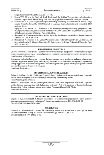 13. Шмелёва Т. В. Стилистика городского ономастикона как фактор креативности // Лингвистика креатива-5 / под общ. ред. Т. А. Гридиной. Екатеринбург: Уральский государственный педагогический университет, 2022. С. 342-362.