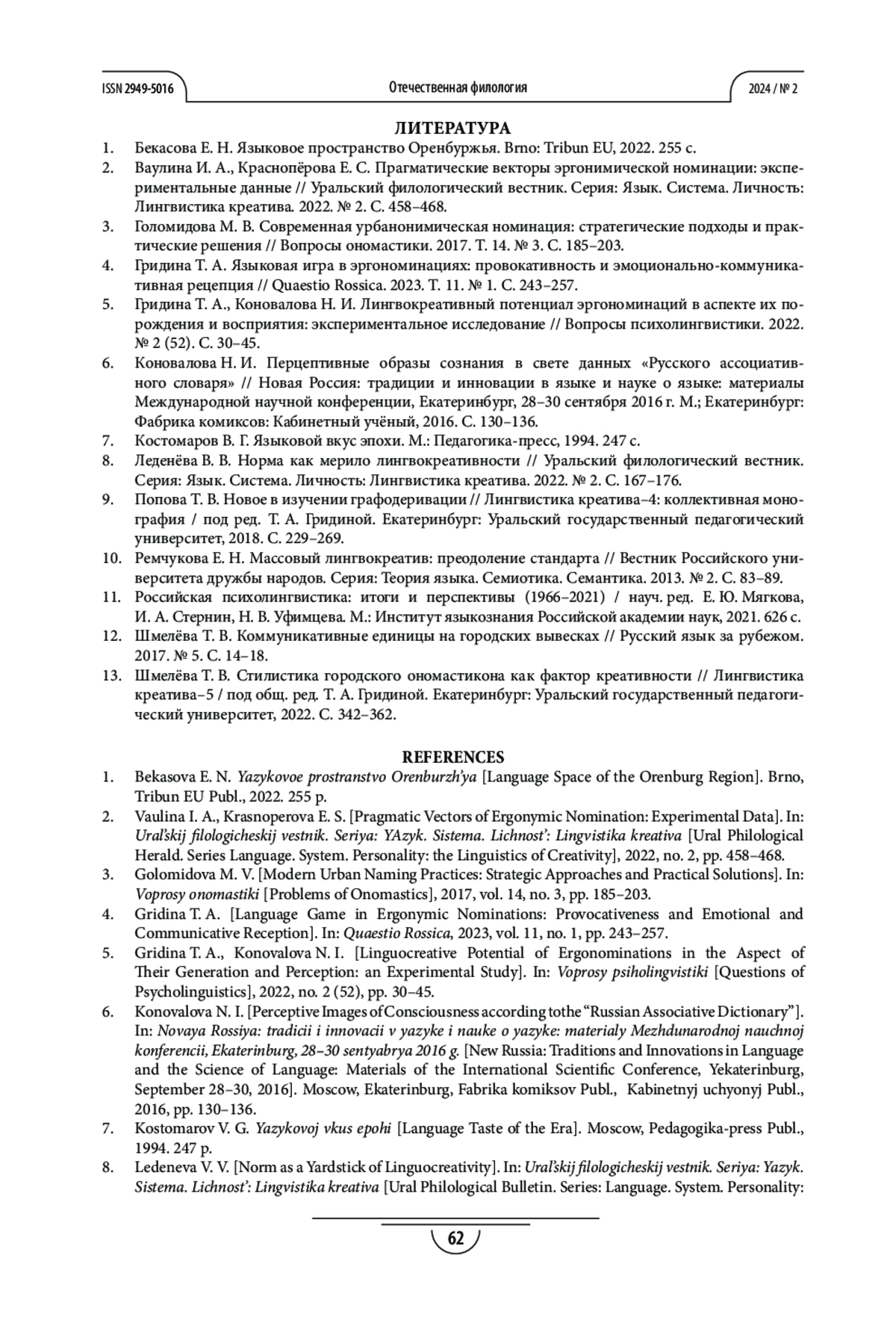 2. Ваулина И. А., Краснопёрова Е. С. Прагматические векторы эргонимической номинации: экспериментальные данные // Уральский филологический вестник. Серия: Язык. Система. Личность: Лингвистика креатива. 2022. № 2. С. 458-468.