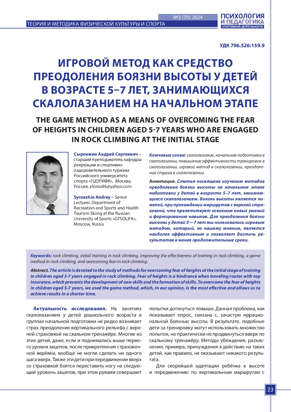 Статья посвящена изучению методов преодоления боязни высоты на начальном этапе подготовки у детей в возрасте 5–7 лет, занимающихся скалолазанием. Боязнь высоты является помехой, при прохождении маршрутов с верхней страховкой, что препятствует освоению новых умений и формированию навыков. Для преодоления боязни высоты у детей 5¬–7 лет мы пользовались игровым методом, который, по нашему мнению, является наиболее эффективным и позволяет достичь результатов в менее продолжительные сроки.