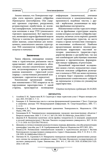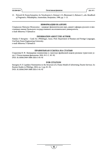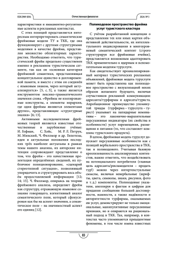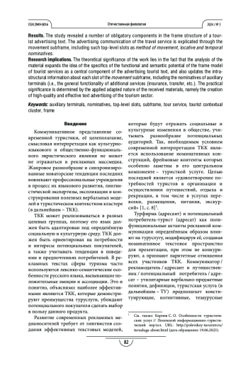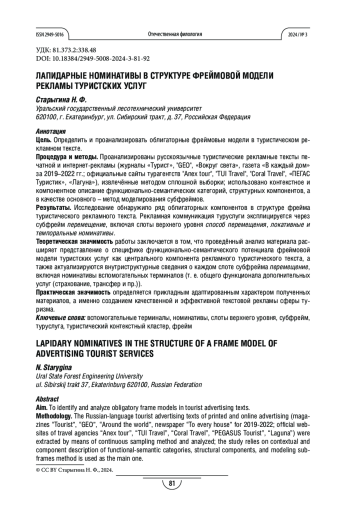 Результаты. Исследование обнаружило ряд облигаторных компонентов в структуре фрейма туристического рекламного текста. Рекламная коммуникация туруслуги эксплицируется через субфрейм перемещение, включая слоты верхнего уровня способ перемещения, локативные и темпоральные номинативы.