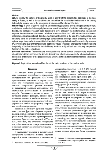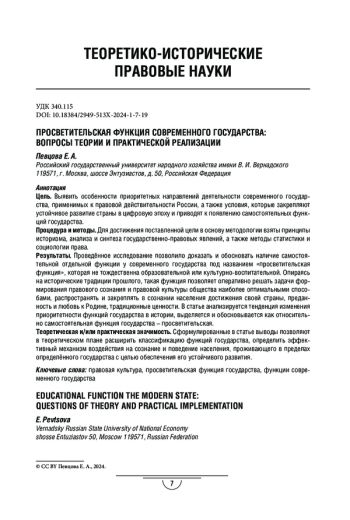 Результаты. Проведённое исследование позволило доказать и обосновать наличие самостоятельной отдельной функции у современного государства под названием «просветительская функция», которая не тождественна образовательной или культурно-воспитательной. Опираясь на исторические традиции прошлого, такая функция позволяет оперативно решать задачи формирования правового сознания и правовой культуры общества наиболее оптимальными способами, распространять и закреплять в сознании населения достижения своей страны, преданность и любовь к Родине, традиционные ценности. В статье анализируется тенденция изменения приоритетности функций государства в истории, выделяется и обосновывается как относительно самостоятельная функция государства – просветительская.