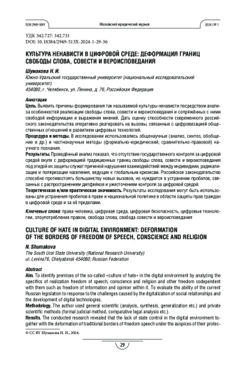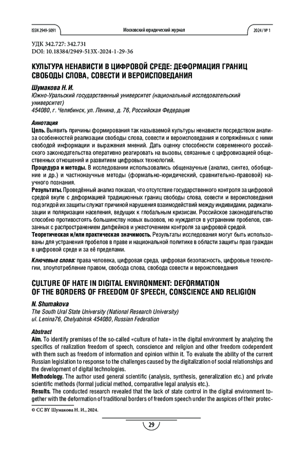 Цель. Выявить причины формирования так называемой культуры ненависти посредством анализа особенностей реализации свободы слова, совести и вероисповедания и сопряжённых с ними свободой информации и выражения мнений. Дать оценку способности современного российского законодательства оперативно реагировать на вызовы, связанные с цифровизацией общественных отношений и развитием цифровых технологий.
