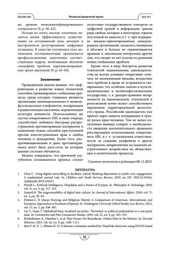Результаты. Проведённый анализ показал, что отсутствие государственного контроля за цифровой средой вкупе с деформацией традиционных границ свободы слова, совести и вероисповедания под эгидой их защиты служат причиной нарушения взаимодействий между индивидами, радикализации и поляризации населения, ведущих к глобальным кризисам. Российское законодательство способно противостоять большинству новых вызовов, но нуждается в устранении пробелов, связанных с распространением дипфейков и ужесточением контроля за цифровой средой.