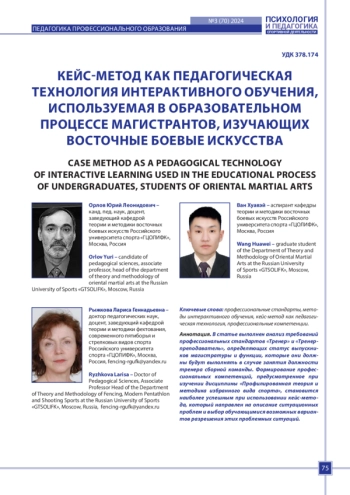 В статье выполнен анализ требований профессиональных стандартов «Тренер» и «Тренерпреподаватель», определяющих статус выпускников магистратуры и функции, которые они должны будут выполнять в случае занятия должности тренера сборной команды. Формирование профессиональных компетенций, предусмотренное при изучении дисциплины «Профилированная теория и методика избранного вида спорта», становится наиболее успешным при использовании кейс-метода, который направлен на описание ситуационных проблем и выбор обучающимися возможных вариантов разрешения этих проблемных ситуаций.