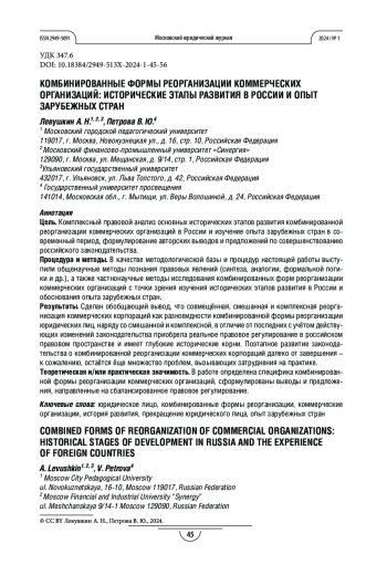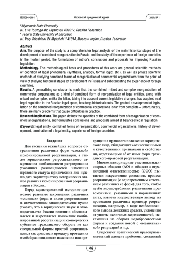 Цель. Комплексный правовой анализ основных исторических этапов развития комбинированной реорганизации коммерческих организаций в России и изучение опыта зарубежных стран в современный период, формулирование авторских выводов и предложений по совершенствованию российского законодательства.