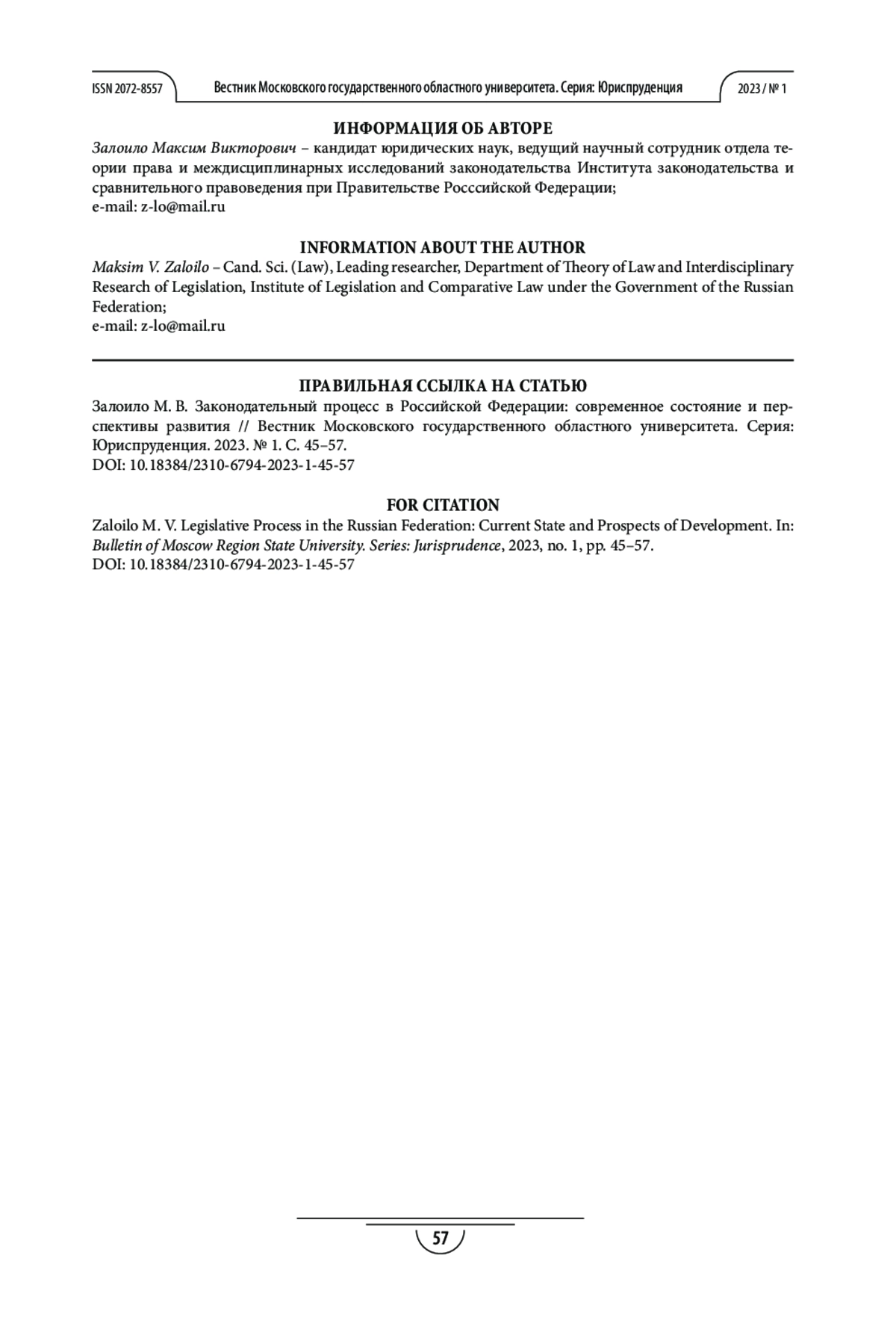 1. Абрамова А. И. Современный законодательный процесс Российской Федерации: стадии и проблемы их совершенствования / А. И. Абрамова // Журнал российского права. - 2007. - № 2. - С. 14-23.