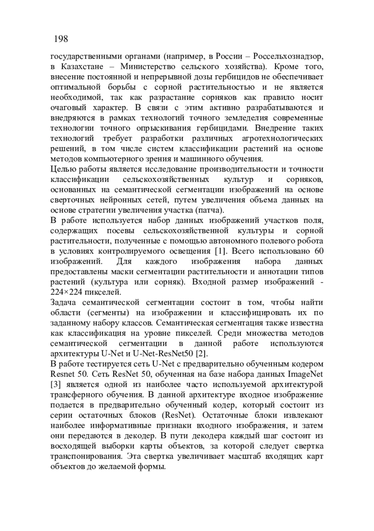 В статье обсуждается проблема семантической сегментации полевых изображений сельскохозяйственной культуры и сорной растительности с использованием архитектур сверточных нейронных сетей. В работе рассматривались две архитектуры: классическая U-Net и U-Net с предварительно обученным кодером Resnet 50. Точность сегментации оценивалась при помощи метрики среднего mIoU, метрики IoU, а также матрицы ошибок классификации. U-Net Resnet 50 показала наилучшую производительность и самую высокую точность (IoU=0,9506; mIoU=0,8723). Результаты могут быть использованы для обучения роботизированных устройств, используемых для точной обработки (опрыскивания) культурных растений в сельском хозяйстве.