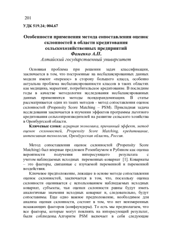 Основная проблема при решении задач классификации, заключается в том, что построенные на несбалансированных данных модели имеют «перекос» в сторону большего класса, особенно актуальна проблема несбалансированности классов в таких областях как медицина, маркетинг, потребительское кредитование. В последние годы в качестве методологии исследования несбалансированных данных применяются методы псевдорандомизации. В статье рассматривается один из таких методов - метод сопоставления оценок склонностей (Propensity Score Matching - PSM). Прикладная задача исследования заключается в изучении эффектов программы льготного кредитования сельхозпроизводителей на развитие сельского хозяйства в Оренбургской области.