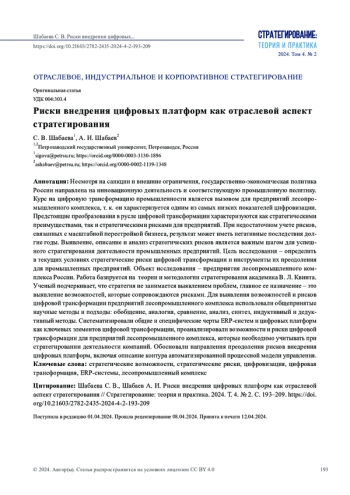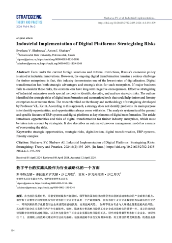 Несмотря на санкции и внешние ограничения, государственно-экономическая политика России направлена на инновационную деятельность и соответствующую промышленную политику. Курс на цифровую трансформацию промышленности является вызовом для предприятий лесопромышленного комплекса, т. к. он характеризуется одним из самых низких показателей цифровизации. Предстоящие преобразования в русле цифровой трансформации характеризуются как стратегическими преимуществами, так и стратегическими рисками для предприятий. При недостаточном учете рисков, связанных с масштабной перестройкой бизнеса, результат может иметь негативные последствия долгие годы. Выявление, описание и анализ стратегических рисков является важным шагом для успешного стратегирования деятельности промышленных предприятий. Цель исследования - определить в текущих условиях стратегические риски цифровой трансформации и инструменты их преодоления для промышленных предприятий. Объект исследования - предприятия лесопромышленного комплекса России. Работа базируется на теории и методологии стратегирования академика В. Л. Квинта. Ученый подчеркивает, что стратегия не занимается выявлением проблем, главное ее назначение - это выявление возможностей, которые сопровождаются рисками. Для выявления возможностей и рисков цифровой трансформации предприятий лесопромышленного комплекса использовали общепринятые научные методы и подходы: обобщение, аналогия, сравнение, анализ, синтез, индуктивный и дедуктивный методы. Систематизировали общие и специфические черты ERP-систем и цифровых платформ как ключевых элементов цифровой трансформации, проанализировали возможности и риски цифровой трансформации для предприятий лесопромышленного комплекса, которые необходимо учитывать при стратегировании деятельности компаний. Обосновали направления преодоления рисков внедрения цифровых платформ, включая описание контура автоматизированной процессной модели управления.