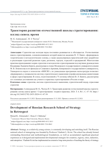 АЛИМУРАДОВ М. К., ЧХОТУА И. З. ТРАЕКТОРИЯ РАЗВИТИЯ ОТЕЧЕСТВЕННОЙ ШКОЛЫ СТРАТЕГИРОВАНИЯ: ВЗГЛЯД СКВОЗЬ ВРЕМЯ // СТРАТЕГИРОВАНИЕ: ТЕОРИЯ И ПРАКТИКА. 2024. Т. 4 № 1 (11)