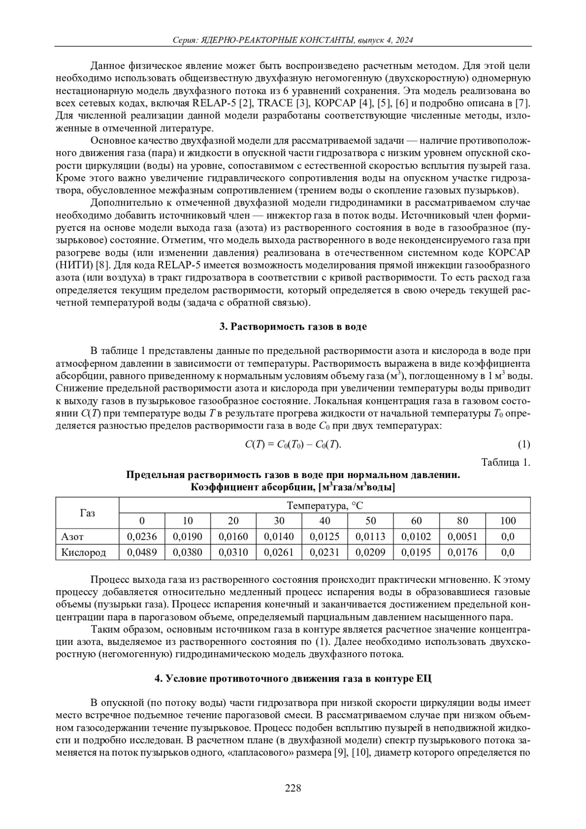 Системы пассивного отвода тепла проектируются для расхолаживания аварийных ядерных реакторов. С целью повышения надежности системы проектируют, используя естественную циркуляцию для отвода остаточных тепловыделений. В ходе проведения экспериментов на простом контуре - имитаторе контура аварийного расхолаживания - получено хорошее совпадение опытных изменений во времени расхода естественной циркуляции и температуры воды и расчетов по коду RELAP-5 в однофазной постановке. При наличии осложняющих геометрию элементов циркуляционного контура, таких как гидрозатвор, часто встречающихся в обычном режиме пассивного отвода тепла, определяется расхождение расчетов с экспериментом. Экспериментаторы назвали причиной несоответствия появления скопления пузырей газа (воздуха) в опускном тракте гидрозатвора, что должно привести к увеличению гидравлического сопротивления и падению расхода циркуляции. Фотография гидрозатвора с прозрачными стенками подтверждена наличием скопления пузырей с объемным газосодержанием на уровне 10 %. Был сделан вывод о необходимости разработки расчетных кодов с моделью, которые более подробно описывают данную ситуацию. Расчетами авторов данной статьи удалось воспроизвести обнаруженное в ФЭИ экспериментальным путем отмеченное явление частичной блокировки расхода естественной циркуляции воды в контуре с гидрозатвором в результате выделения азота и кислорода из растворенного состояния в газообразном состоянии при постоянной мощности нагревателя. В основе расчетной методики использовалась модель гидродинамики с сохранением шести эффектов на основе широко применяемой на основе применения двухфазной гомогенной (двухскоростной) одномерной нестационарной гидродинамической модели. В моделях дополнительно зависит зависимость пределов растворимости газов от температуры.