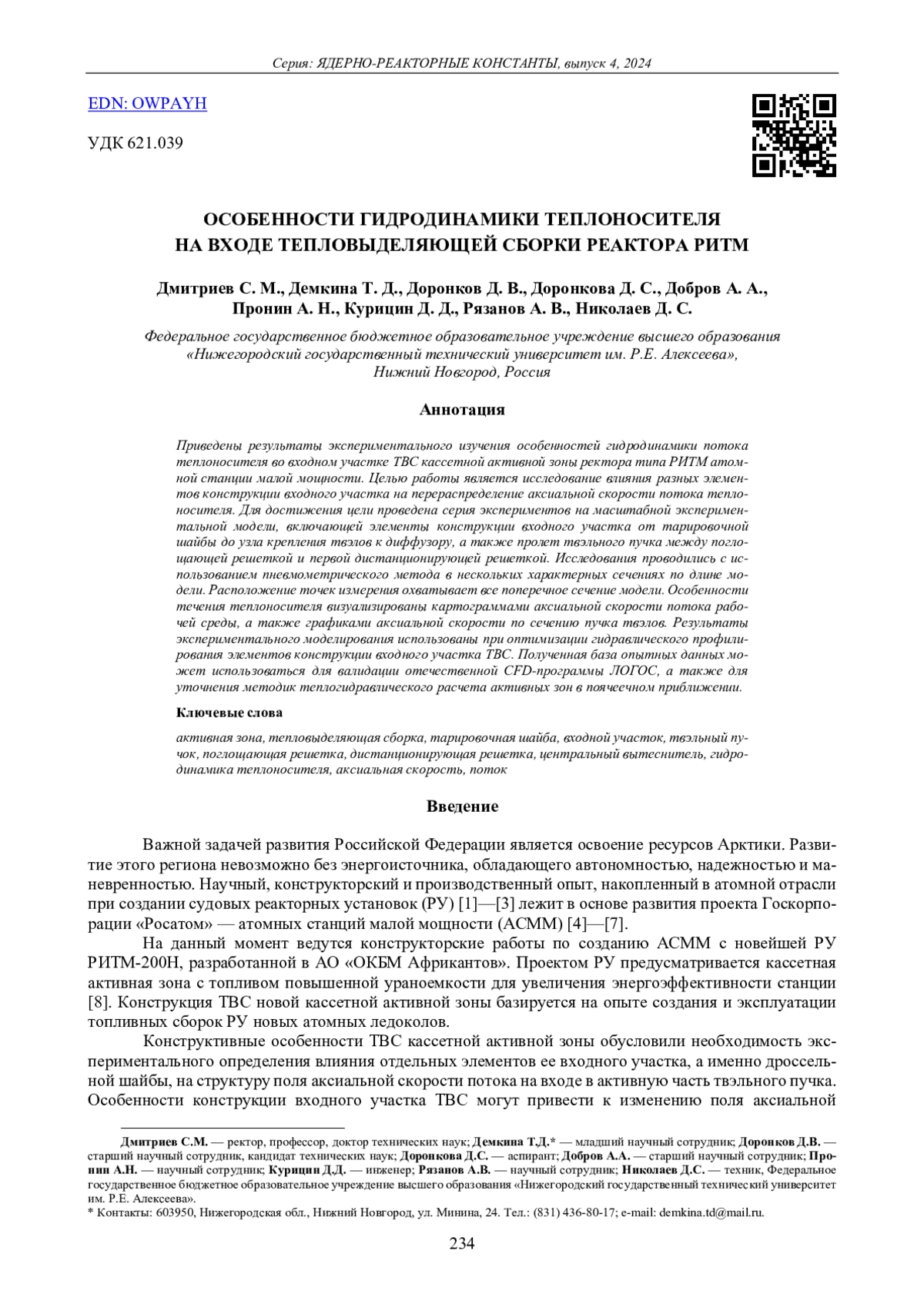 4. Дмитриев С.М., Самойлов О.Б., Куприянов А.В., Осин А.Б. Экспериментальные исследования возникновения и развития кризиса теплоотдачи в модели ТВС реактора полномасштабного сечения РИТМ-200 для АСММ. Атомная энергия, 2022, т. 2, с. 133, вып. 1, с. 30-33. EDN: WNWHAE
