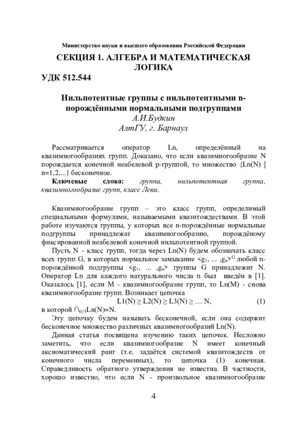 2. Будкин А.И., Таранина Л.В. О квазимногообразиях Леви, порождённых нильпотентными группами // Сиб. мат. журн. - 2000. - Т.41, №2. - С. 270-277. EDN: YVKCCP