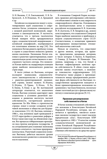 Теоретическая и/или практическая значимость. Сделан сравнительно-правовой анализ правового регулирования собственности в отдельных современных социалистических странах, экономика которых успешно сочетает плановые и рыночные начала. Данный подход позволяет определить устойчивое развитие экономики, существенное снижение уровня бедности населения. Полученные результаты могут быть использованы в процессе разнопланового сотрудничества России с Китаем, Вьетнамом и Северной Кореей.