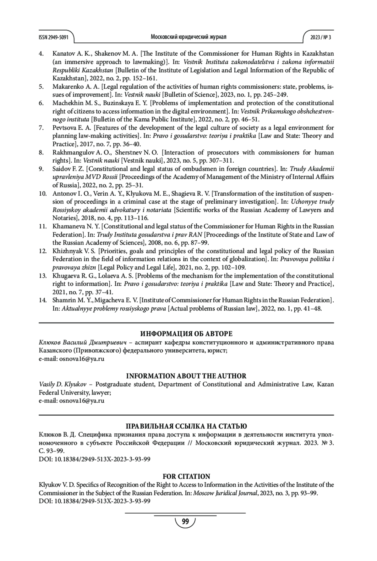 11. Хаманева Н. Ю. Конституционно-правовой статус Уполномоченного по правам человека в Российской Федерации // Труды Института государства и права РАН. 2008. № 6. С. 87-99.