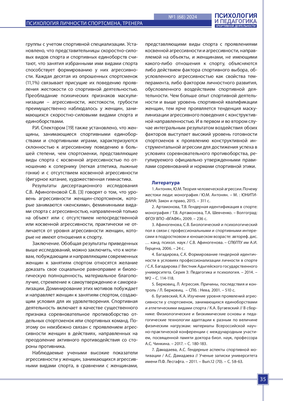 6. Бугаевский, К.А. Изучение уровня проявлений агрессивности у спортсменок, занимающихся единоборствами и атлетическими видами спорта / К.А. Бугаевский // В сборнике: Физиологические и биохимические основы и педагогические технологии адаптации к разным по величине физическим нагрузкам: материалы Всероссийской науч- но-практической конференции с международным участием, посвященной памяти доктора биол. наук, профессора А.С. Чинкина. – 2017. – С. 180-183.