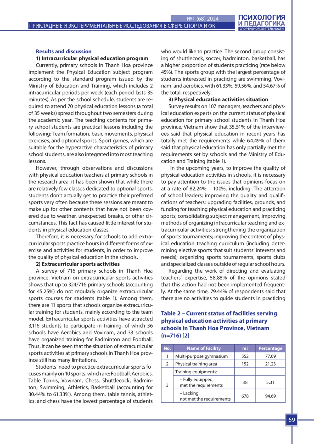 С помощью научно-исследовательских методов, широко используемых в области физической культуры и спорта, в рамках проекта была проведена общая оценка текущего состояния физического воспитания и школьного спорта в начальных школах провинции Тханьхоа, Вьетнам, посредством следующего содержания: Внутриклассная программа по физическому воспитанию, внеклассная спортивная деятельность, физкультурная работа, материально-техническая база, учительский состав, результаты обучения предмету физическое воспитание ученики. Тем самым создавая научные аргументы для эффективного внедрения физического воспитания и школьного спорта в начальных школах провинции Тханьхоа, Вьетнам.