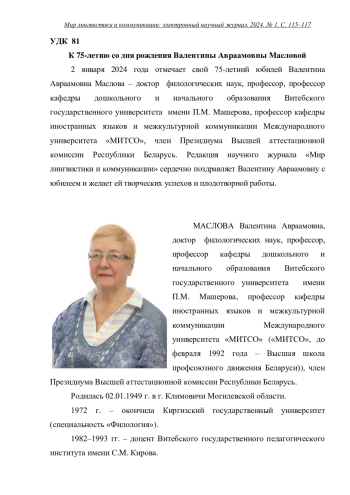 2 января 2024 года отмечает свой 75-летний юбилей Валентина Авраамовна Маслова – доктор филологических наук, профессор, профессор кафедры дошкольного и начального образования Витебского государственного университета имени П. М. Машерова, профессор кафедры иностранных языков и межкультурной коммуникации Международного университета «МИТСО», член Президиума Высшей аттестационной комиссии Республики Беларусь.
