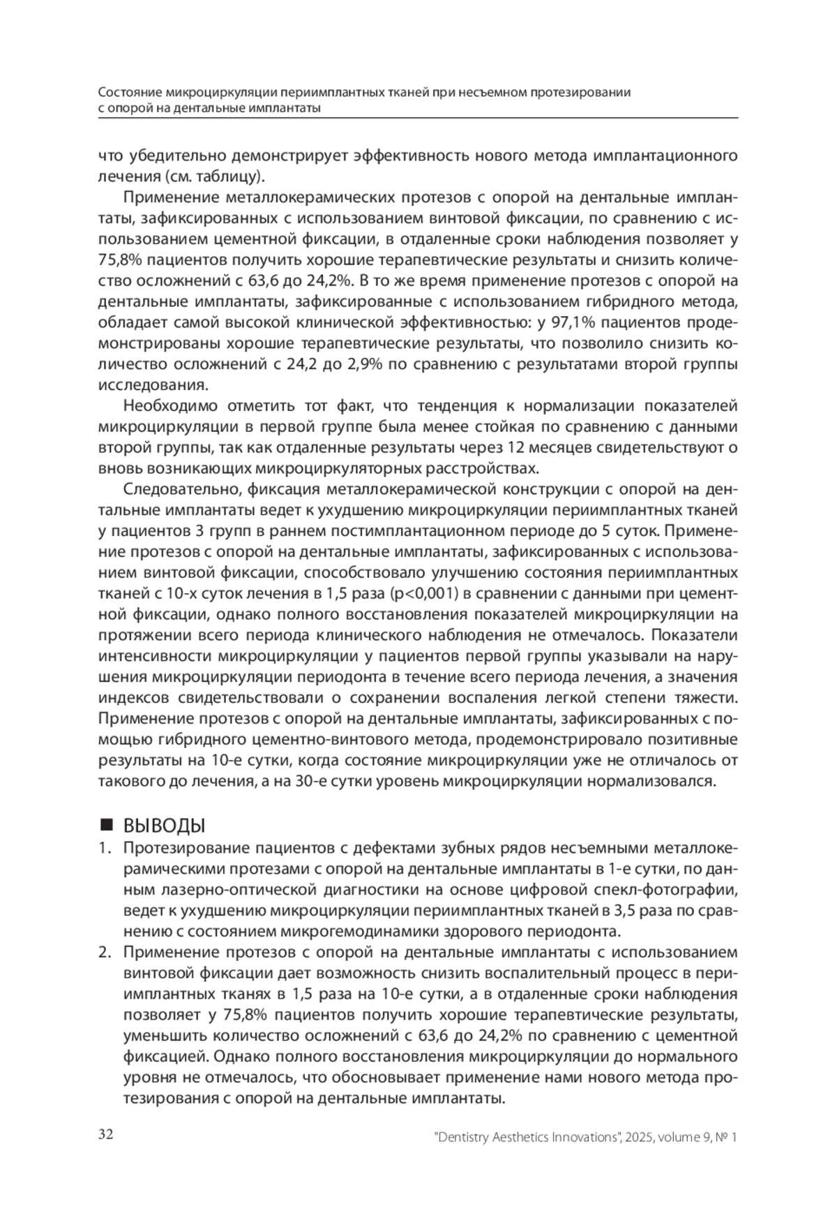 РУБНИКОВИЧ С. П., ДЕНИСОВА Ю. Л., ПРЯЛКИН С. В. СОСТОЯНИЕ МИКРОЦИРКУЛЯЦИИ ПЕРИИМПЛАНТНЫХ ТКАНЕЙ ПРИ НЕСЪЕМНОМ ПРОТЕЗИРОВАНИИ С ОПОРОЙ НА ДЕНТАЛЬНЫЕ ИМПЛАНТАТЫ // СТОМАТОЛОГИЯ. ЭСТЕТИКА. ИННОВАЦИИ. 2025. № 1, ТОМ 9