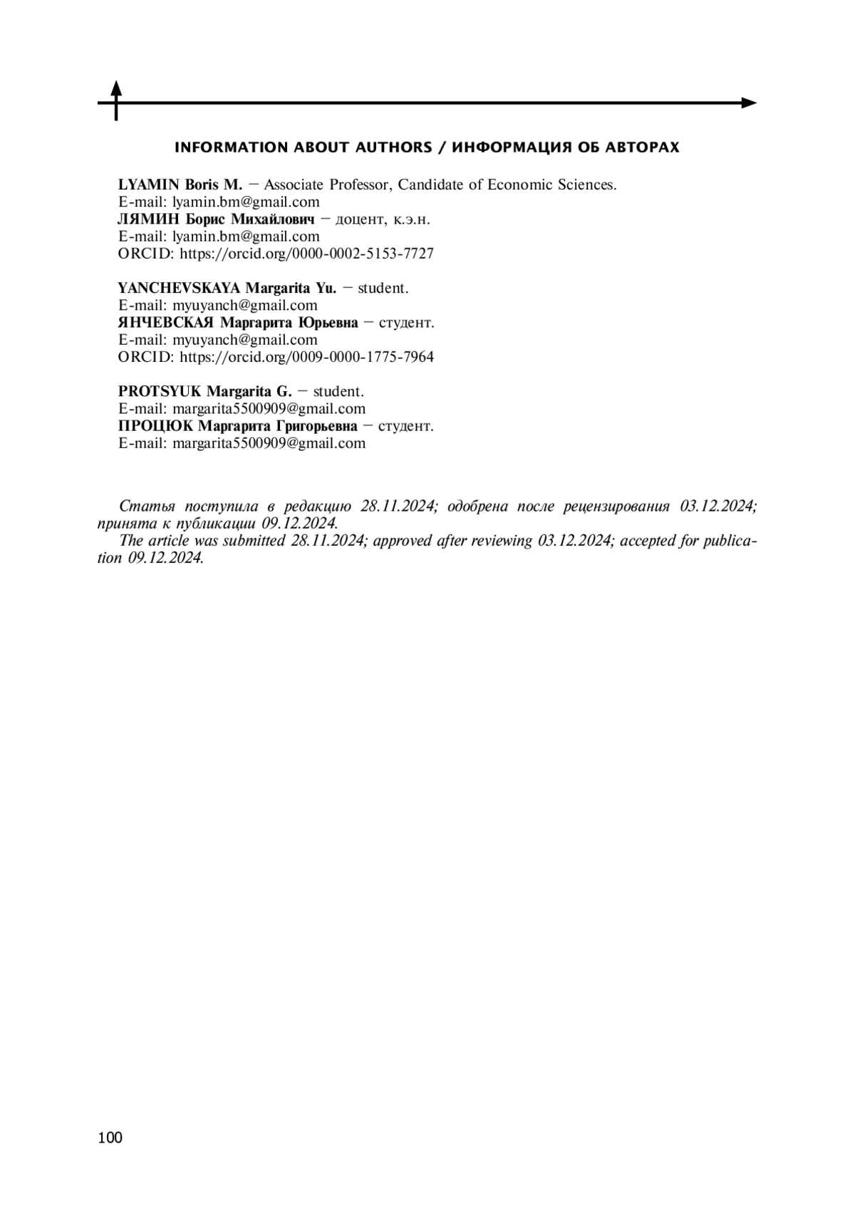11. Lyamin B.M., Yanchevskaya M.Y., Chetyrkina N.Y. 2023. Process approach as a way to improve the competitiveness of domestic enterprises of hotel and tourist industry. St. Petersburg Economic Journal 4, 57-66. EDN: XTHYTP