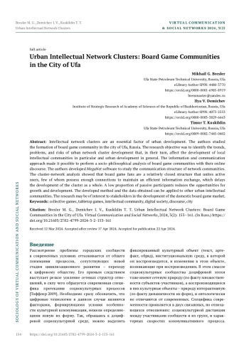 Интеллектуальные сетевые кластеры городского сообщества являются существенным фактором развития городов. В работе на примере сообщества любителей настольных игр г. Уфа показаны проблемы развития сообществ. Цель - выявить проблемы и риски формирования сетевых кластеров городского сообщества, оказывающих влияние на развитие как интеллектуальных сообществ города, так и самого города. На основе информационно-коммуникационного подхода был проведен социально-философский анализ социального потока любителей коллективных настольных игр, ключевых направлений формирования общего дискурса подобных сетевых сообществ. Выявлены основные тенденции и риски развития. Описана методика исследования структуры коммуникаций сетевых сообществ с использованием авторской программы MegaNet. В результате кластерно-сетевой анализ показал, что сообщество любителей коллективных игр является относительно замкнутой структурой, объединяющей активных пользователей, но с недостаточной долей пользователей с минимальным числом связей, что не позволяет поддерживать динамику информационного обмена и задерживает развитие самого кластера в целом. Эти данные можно экстраполировать на развитие интеллектуальных сообществ города. Недостаточная доля пассивных участников снижает возможности роста и развития сообщества вообще. Прикладное значение работы выражается в передаче данных исследования организациям, заинтересованным в развитии рынка коллективных игр, для проведения комплекса мероприятий по устранению выявленной проблемы.