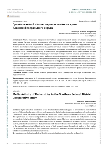 Статья посвящена продвижению учебных заведений высшей школы юга России средствами новых медиа. Научная новизна исследования обусловлена тем, что данная проблема до сих пор остается малоизученной. Высокая актуальность следует из наблюдаемых сейчас процессов цифровизации вузов. В статье рассматривается медиаактивность десяти ключевых высших учебных заведений Южного федерального округа, выделенных на основе сопоставления локальных и федеральных рейтингов отечественных вузов. Цель - отобразить практику использования инструментов новых медиа учреждениями высшей школы в этом регионе Российской Федерации. С помощью методов контент-анализа, сравнительного анализа и типологизации исследуются такие цифровые коммуникационные площадки, как сайты вузов, видеохостинги, мессенджеры и соцсети. Университеты и институты, широко представленные в современном региональном инфополе и значительно опережающие своих конкурентов в использовании новых медиа, являются образовательными лидерами региона. Продемонстрированы слабые и сильные стороны коммуникативных стратегий образовательных учреждений, для их компаративного анализа используются как количественные, так и качественные показатели. Кратко рассматривается медиаактивность Южного федерального университета - главного вуза округа.