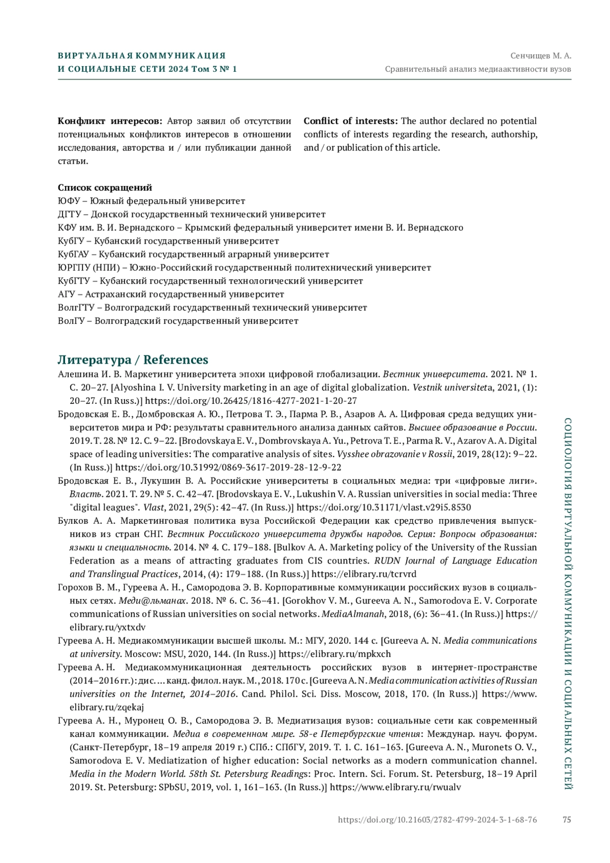 3. Бродовская Е. В., Лукушин В. А. Российские университеты в социальных медиа: три “цифровые лиги”. Власть. 2021. Т. 29. № 5. С. 42-47. DOI: 10.31171/vlast.v29i5.8530 EDN: QDIVLB