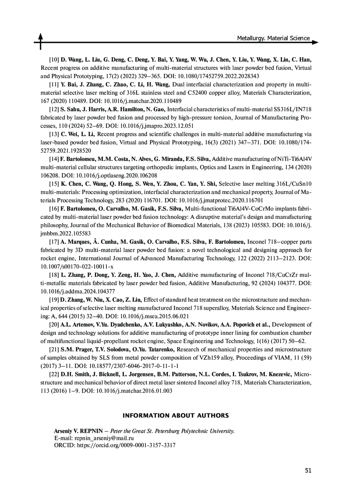 12. Sahu S., Harris J., Hamilton A.R., Gao N. Interfacial characteristics of multi-material SS316L/IN718 fabricated by laser powder bed fusion and processed by high-pressure torsion // Journal of Manufacturing Processes. 2024. Vol. 110. P. 52-69. DOI: 10.1016/j.jmapro.2023.12.051 EDN: XVZBKF