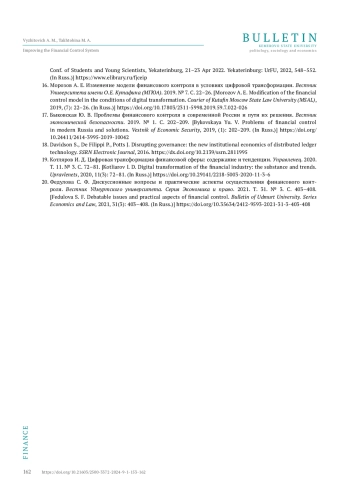 16. Морозов А. Е. Изменение модели финансового контроля в условиях цифровой трансформации. Вестник Университета имени О.Е. Кутафина (МГЮА). 2019. № 7. С. 22-26. DOI: 10.17803/2311-5998.2019.59.7.022-026 EDN: AIUBRX