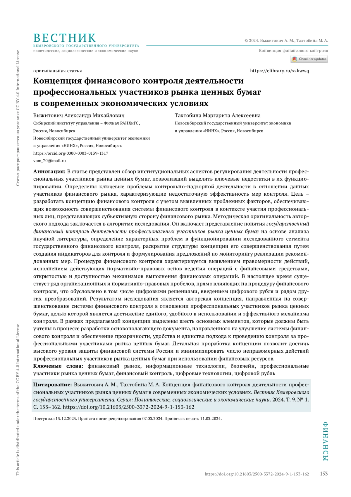 В статье представлен обзор институциональных аспектов регулирования деятельности профессиональных участников рынка ценных бумаг, позволивший выделить ключевые недостатки в их функционировании. Определены ключевые проблемы контрольно-надзорной деятельности в отношении данных участников финансового рынка, характеризующие недостаточную эффективность мер контроля. Цель - разработать концепцию финансового контроля с учетом выявленных проблемных факторов, обеспечивающих возможность совершенствования системы финансового контроля в контексте участия профессиональных лиц, представляющих субъективную сторону финансового рынка. Методическая оригинальность авторского подхода заключается в алгоритме исследования. Он включает представление понятия государственный финансовый контроль деятельности профессиональных участников рынка ценных бумаг на основе анализа научной литературы, определение характерных проблем в функционировании исследованного сегмента государственного финансового контроля, раскрытие структуры концепции его совершенствования путем создания индикаторов для контроля и формулирования предложений по мониторингу реализации рекомендованных мер. Процедура финансового контроля характеризуется выявлением правомерности действий, исполнением действующих нормативно-правовых основ ведения операций с финансовыми средствами, открытостью и доступностью механизмов выполнения финансовых операций. В настоящее время существует ряд организационных и нормативно-правовых пробелов, прямо влияющих на процедуру финансового контроля, что обусловлено в том числе цифровыми решениями, введением цифрового рубля и рядом других преобразований. Результатом исследования является авторская концепция, направленная на совершенствование системы финансового контроля в отношении профессиональных участников рынка ценных бумаг, целью которой является достижение единого, удобного в использовании и эффективного механизма контроля. В рамках предлагаемой концепции выделены шесть основных элементов, которые должны быть учтены в процессе разработки основополагающего документа, направленного на улучшение системы финансового контроля и обеспечение прозрачности, удобства и единства подхода к проведению контроля за профессиональными участниками рынка ценных бумаг. Детальная проработка концепции позволит достичь высокого уровня защиты финансовой системы России и минимизировать число неправомерных действий профессиональных участников рынка ценных бумаг при использовании финансовых ресурсов.