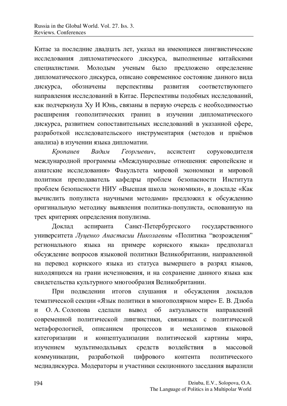 25–27 апреля 2024 года в Санкт-Петербургском государственном университете состоялся II Санкт-Петербургский международный конгресс исследователей международных отношений «Глобальные и региональные вызовы в меняющемся мире». Конгресс явился «площадкой для открытого профессионального диалога представителей академических учреждений и экспертных институтов в области международных отношений в условиях современных вызовов международной безопасности, глобальных перемен в мировой политической системе». Научная и практическая значимость конгресса обусловлена «необходимостью выявления и обобщении ключевых фундаментальных теоретических и наиболее перспективных практических разработок в области международных отношений, нацеленных на преодоление кризисных явлений в мировом развитии». В конгрессе приняли участие специалисты в области истории, философии, экономики, политической географии, международных отношений и политической коммуникации. В рамках конгресса были организованы открытые лекции, круглые столы, тематические секции. Одной из таких тематических секций была заявлена секция «Язык политики в многополярном мире». При подведении итогов слушания и обсуждения докладов данной тематической секции был сформулирован вывод об актуальности направлений современной политической лингвистики, которые связаны с изучением механизмов и средств формирования политической картины мира, рассмотрением инструментов создания конфликтного регистра политического дискурса, функционированием поликодовых текстов в массовой коммуникации, разработкой цифрового контента политического медиадискурса. В заключение модераторы подчеркнули, что язык играет ключевую роль в международной политике, он служит основным средством коммуникации и понимания между государствами, оказывает существенное влияние на культурные и дипломатические отношения, способствуя или препятствуя сотрудничеству и разрешению конфликтов. Было также отмечено, что во время работы секции звучали языки, которые занимают лидирующие позиции в мире по количеству говорящих на них (английский, испанский, китайский, русский, хинди). Ведущие предложили считать это хорошим знаком и замечательным началом новой традиции проведения ежегодной тематической секции, посвященной языку политики и дипломатии, в рамках Санкт-Петербургского международного конгресса исследователей международных отношений «Глобальные и региональные вызовы в меняющемся мире».
