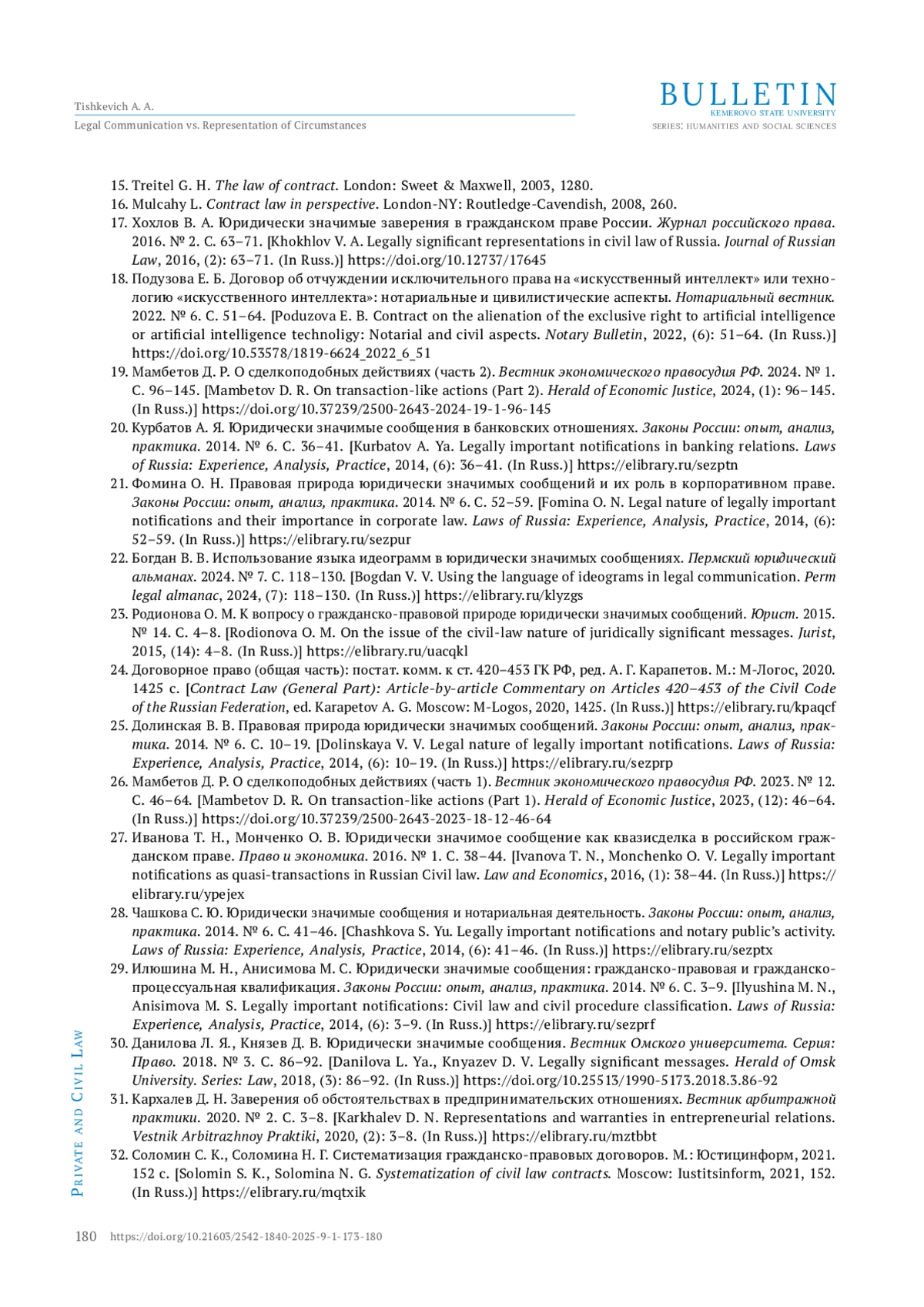 ТИШКЕВИЧ А. А. СООТНОШЕНИЕ ЮРИДИЧЕСКИ ЗНАЧИМЫХ СООБЩЕНИЙ И ЗАВЕРЕНИЙ ОБ ОБСТОЯТЕЛЬСТВАХ В ГРАЖДАНСКОМ ПРАВЕ РОССИИ // ВЕСТНИК КЕМЕРОВСКОГО ГОСУДАРСТВЕННОГО УНИВЕРСИТЕТА. СЕРИЯ: ГУМАНИТАРНЫЕ И ОБЩЕСТВЕННЫЕ НАУКИ. 2025. Т. 9 № 1 (33
