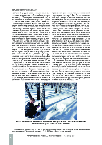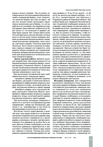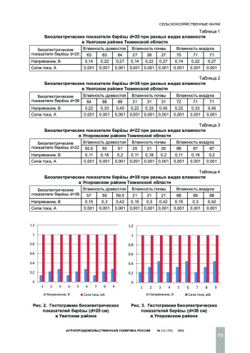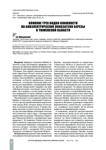 В статье затрагивается тема о неэффективном использовании такого лесного ресурса, как древостой берёзы, особенно в период её интенсивного роста, основной причиной которого является низкий спрос на товары из данного сырья, удаленность от основных магистралей и высокий процент неликвида. Выполнено исследование, в котором несколько видов влажности могут оказывать или не оказывать различного рода влияние на биоэлектрические показали берёзы, растущей в лесостепных и таёжных условиях юга Тюменской области. Описана методика измерения каждого вида влажности. Произведён отбор местности и деревьев по определённым условиям перед исследованием приборами. После комплексного выполнения замеров были проведены отдельные замеры на исследуемых деревьях с целью достоверности полученных значений. Все результаты заполнялись в специальных таблицах для последующей обработки данных. На основании полученных значений были построены графики, отображающие влияние трёх видов влажности на внутреннее напряжение и силу тока внутри берёз, произрастающих на юге Тюменской области. В результате проводимых исследований выяснилось, что два вида влажности оказывают прямое воздействие на внутреннюю влажность дерева, а оно, в свою очередь, может незначительно влиять на внутреннее напряжение. При измерении силы тока внутри дерева, даже при разных диаметрах и лесорастительных условиях, этот показатель нигде не менялся и составлял 0,001 А. Таким образом, все виды влажности, взаимосвязанные между собой, оказывают влияние на незначительное повышение внутреннего напряжения растущего дерева берёзы.