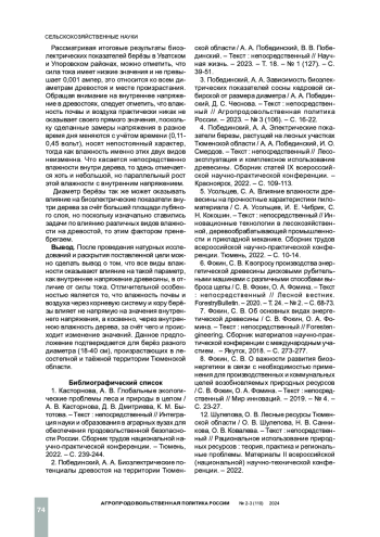 4. Побединский, А. А. Зависимость биоэлектрических показателей сосны кедровой сибирской от размера диаметра / А. А. Побединский, Д. С. Чеснова. - Текст: непосредственный // Агропродовольственная политика России. - 2023. - № 3 (106). - С. 16-22. EDN: BRNXGC