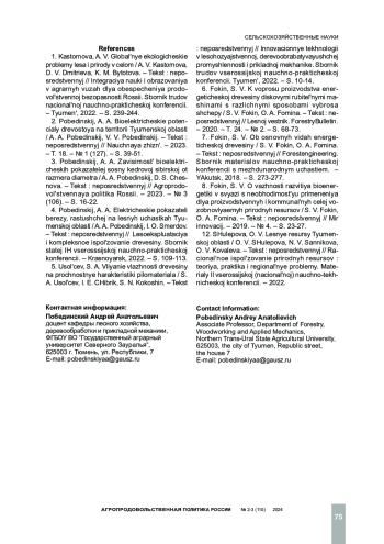 5. Побединский, А. А. Электрические показатели березы, растущей на лесных участках Тюменской области / А. А. Побединский, И. О. Смердов. - Текст: непосредственный // Лесоэксплуатация и комплексное использование древесины. Сборник статей IХ всеросссийской научно-практической конференции. - Красноярск, 2022. - С. 109-113. EDN: XSOKFB