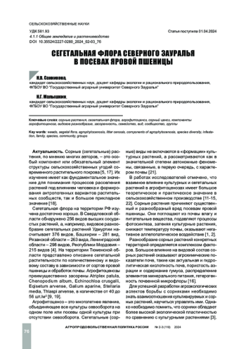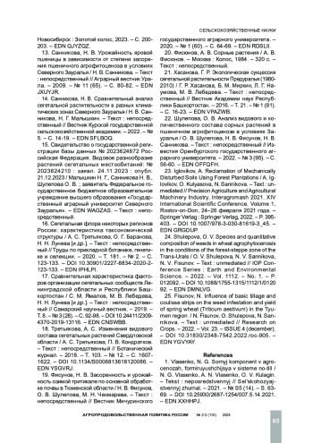22. Шулепова, О. В. Анализ видового и количественного состава сорных растений в пшеничном агрофитоценозе в условиях Зауралья / О. В. Шулепова, Н. В. Фисунов, Н. В. Санникова. - Текст: непосредственный // Известия Оренбургского государственного аграрного университета. - 2022. - № 3 (95). - С. 56-60. EDN: OFFQFH