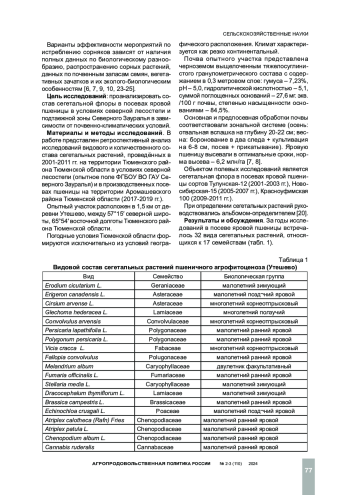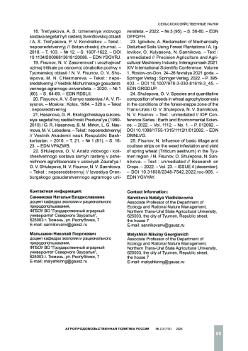 25. Fisunov, N. Influence of basic tillage and coulisse strips on the weed infestation and yield of spring wheat (Triticum aestivum) in the Tyumen region / N. Fisunov, O. Shulepova, N. Sannikova. - Text: unmediated // Research on Crops. - 2022. - Vol. 23. - ISSUE 4 (december). DOI: 10.31830/2348-7542.2022.roc-905 EDN: YGVYAY