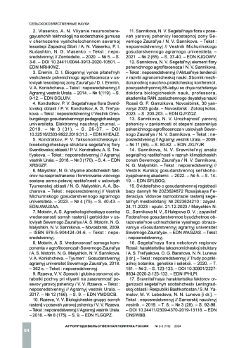 11. Санникова, Н. В. Сегетальная флора в посевах яровой пшеницы лесостепной зоны Северного Зауралья / Н. В. Санникова. - Текст: непосредственный // Вестник Мичуринского государственного аграрного университета. - 2021. - № 2 (65). - С. 37-40. EDN: KJQOWV