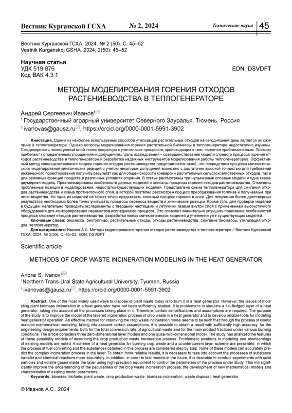 12. Иванов A.C. Моделирование процес са теплопроводности при сжигании растительных отходов в теплогенераторе // Сельский механизатор. 2024. № 3. С. 12-13. DOI: 10.47336/0131-7393-2024-3-12-13-24 EDN: BDJYKC