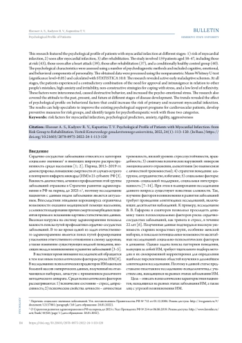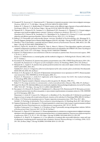 9. Кадыров Р. В., Эльзессер А. С., Бартковская Н. С. Психологические факторы инфаркта миокарда как поле для клинико-психологических исследований. Вестник Кемеровского государственного университета. 2020. Т. 22. № 2. С. 437-443. DOI: 10.21603/2078-8975-2020-22-2-437-443 EDN: KQEXUN