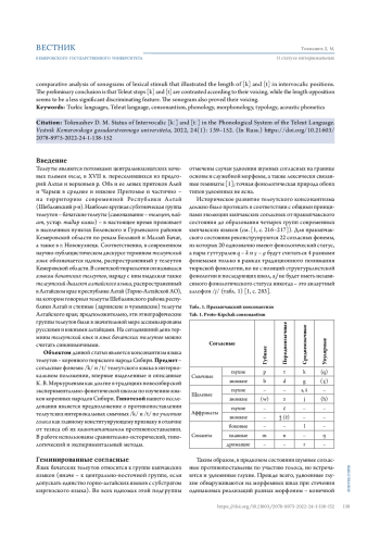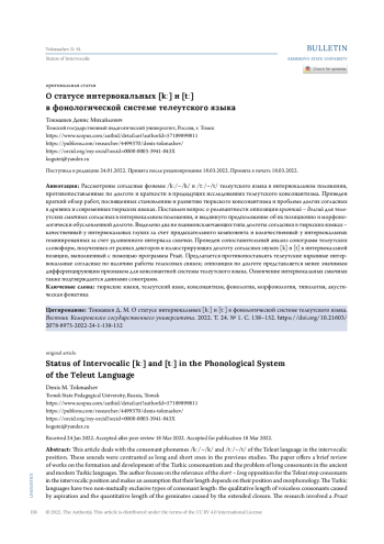Рассмотрены согласные фонемы /kː/~/k/ и /tː/~/t/ телеутского языка в интервокальном положении, противопоставленные по долготе и краткости в предыдущих исследованиях телеутского консонантизма. Приведен краткий обзор работ, посвященных становлению и развитию тюркского консонантизма и проблеме долгих согласных в древних и современных тюркских языках. Поставлен вопрос о релевантности оппозиции краткий - долгий для телеутских смычных согласных в интервокальном положении, и выдвинуто предположение об их позиционно и морфонологически обусловленной долготе. Выделено два не взаимоисключающих типа долготы согласных в тюркских языках - качественный у интервокальных глухих за счет придыхательного компонента и количественный у интервокальных геминированных за счет удлиненного интервала смычки. Проведен сопоставительный анализ сонограмм телеутских словоформ, полученных от разных дикторов и иллюстрирующих долготу согласных звуков [k] и [t] в интервокальной позиции, выполненный с помощью программы Praat. Предлагается противопоставлять телеутские взрывные интервокальные согласные по наличию работы голосовых связок; оппозиция по долготе представляется менее значимым дифференцирующим признаком для консонантной системы телеутского языка. Озвончение интервокальных смычных также подтверждается данными сонограмм.