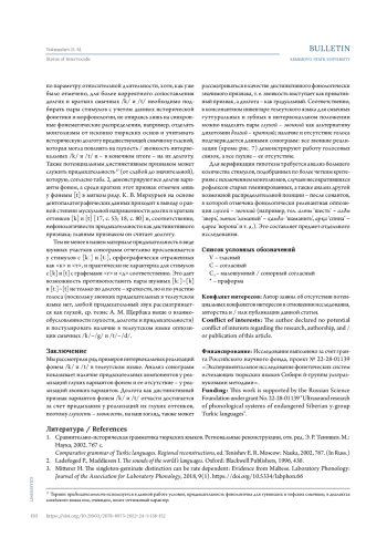 19. Селютина И. Я. Артикуляторные характеристики шумных переднеязычных согласных в языке телеутов (по данным МРТ). Сибирский филологический журнал. 2019. № 4. С. 197-209. DOI: 10.17223/18137083/69/17 EDN: JHDCHK