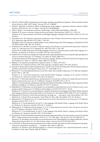 18. Меркурьев К. В. Переднеязычные фонемы [t] и [tː] в языке бачатских телеутов. Язык бачатских телеутов, ред. Е. И. Убрятова. Кемерово: КемГУ, 1976. С. 72-80.