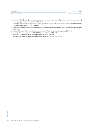 21. Уртегешев Н. С. Фонико-фонологическая система шорского языка в южносибирском тюркском контексте: автореф. дис. … д-ра филол. наук. Новосибирск, 2021. 45 с. EDN: RUQXKU