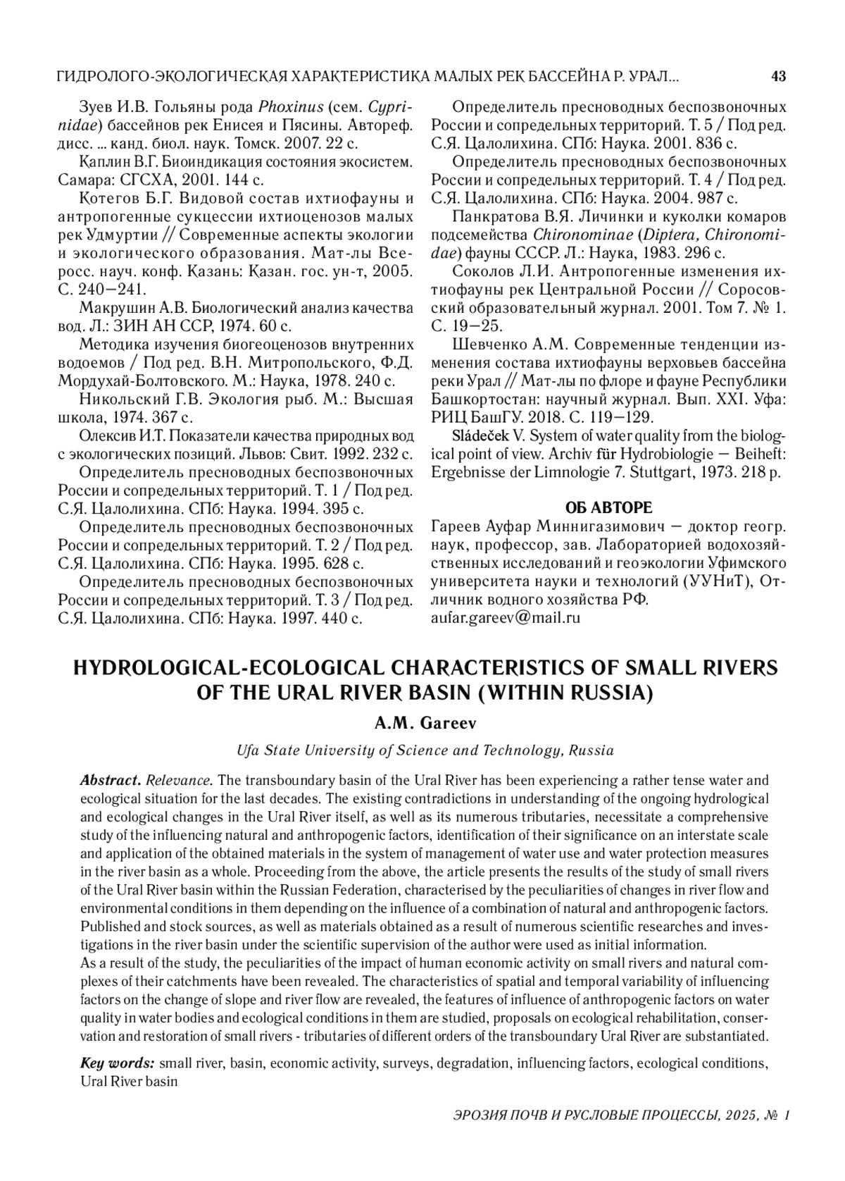 На основании анализа большого количества опубликованных работ, материалов полевых изысканий можно отметить, что в течение последних десятилетий по значительному количеству бассейнов рек в пределах Российской Федерации обнаруживается формирование довольно напряженной водохозяйственной и гидролого-экологической обстановки. К одному из таких относится и бассейн трансграничной реки Урал, на примере которого достаточно четко выявляются различия и характеристики влияния естественных и антропогенных факторов на морфометрические характеристики русел малых рек, гидрологический режим и гидроАннотация. Актуальность. В трансграничном бассейне р. Урал в течение последних десятилетий наблюдается довольно напряженная водохозяйственная и экологическая обстановка. Имеющиеся противоречия в понимании происходящих гидрологических и экологических изменений в самой р. Урал, а также в многочисленных ее притоках, обусловливают необходимость всестороннего изучения влияющих естественных и антропогенных факторов, выявления их значимости в межгосударственном масштабе и применения полученных материалов в системе управления водопользованием и водоохранными мероприятиями по бассейну реки в целом. Исходя из сказанного выше, в статье излагаются результаты исследования малых рек бассейна р. Урал в пределах Российской Федерации, характеризующихся особенностями изменения речного стока и экологических условий в них в зависимости от влияния совокупности естественных и антропогенных факторов. В качестве исходной информации использованы опубликованные и фондовые источники, а также материалы, полученные в результате выполнения многочисленных научных исследований и изысканий по бассейну реки под научным руководством автора. В результате проведенного исследования выявлены особенности влияния хозяйственной деятельности человека на малые реки и природные комплексы их водосборов. Раскрыты характеристики пространственной и временной изменчивости факторов, влияющих на изменение склонового и речного стока, изучены особенности влияния антропогенных факторов на качество воды в водных объектах и экологические условия в них, обоснованы предложения по экологической реабилитации, сохранению и восстановлению малых рек – притоков различного порядка трансграничной реки Урал. Ключевые слова: малая река, бассейн, хозяйственная деятельность, изыскания, деградация, влияющие факторы, экологические условия, бассейн реки Урал DOI: 10.71367/3034-4638-2025-2-1-32-45 лого-экологические условия в них. Исходя из этого, в статье излагаются результаты исследования по малым рекам бассейна р. Урал в пределах России, характеризующимся особенностями изменения речного стока и экологических условий в зависимости от влияния совокупности естественных и антропогенных факторов.