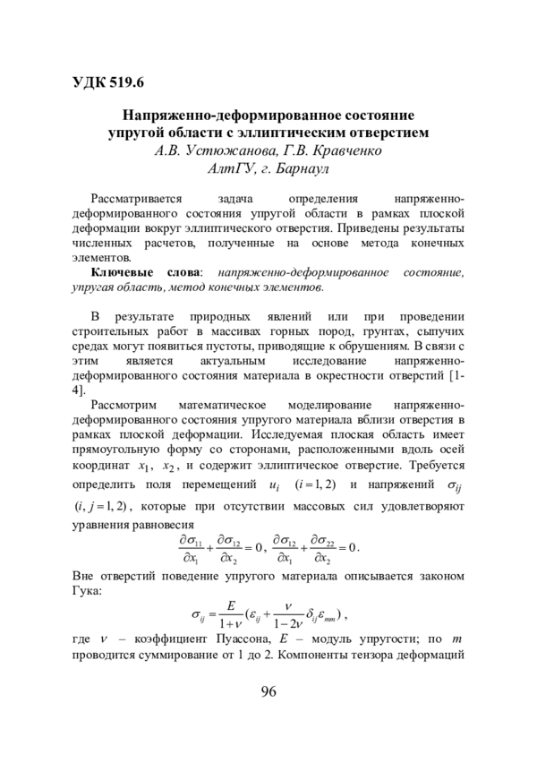 В результате природных явлений или при проведении строительных работ в массивах горных пород, грунтах, сыпучих средах могут появиться пустоты, приводящие к обрушениям. В связи с этим является актуальным исследование напряженно-деформированного состояния материала в окрестности отверстий [1- 4]. Рассмотрим математическое моделирование напряженно-деформированного состояния упругого материала вблизи отверстия в рамках плоской деформации. Исследуемая плоская область имеет прямоугольную форму со сторонами, расположенными вдоль осей координат 1x, 2x, и содержит эллиптическое отверстие.