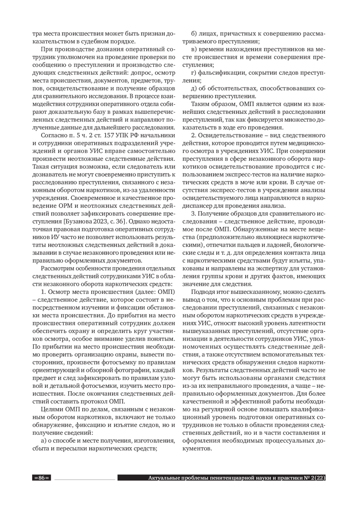 2. Бузанова 2023 - Бузанова А. Р. Особенности возбуждения уголовных дел по преступлениям, связанным с незаконным оборотом наркотических средств, совершаемым в исправительных учреждениях // Ведомости уголовно-исполнительной системы. 2023. № 10. С. 29-38. EDN: ZTIFXB