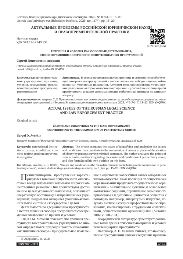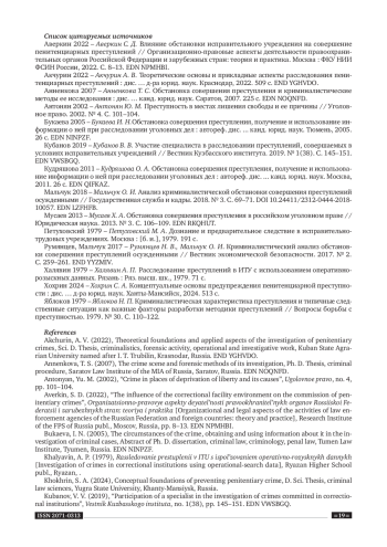 1. Аверкин 2022 - Аверкин С. Д. Влияние обстановки исправительного учреждения на совершение пенитенциарных преступлений // Организационно-правовые аспекты деятельности правоохранительных органов Российской Федерации и зарубежных стран: теория и практика. Москва: ФКУ НИИ ФСИН России, 2022. С. 8-13. EDN: NPMHBI